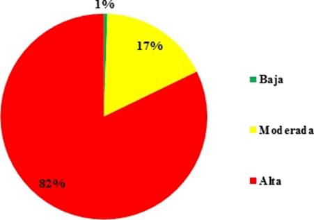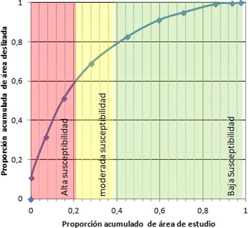 El área total que abarcan las superficies de ruptura de los diferentes tipos de procesos de remoción en masa para este territorio fue de 6.33 km2. Las zonas de baja susceptibilidad se asocian con apenas un 0.035 km2, equivalente a 0.55% del área total deslizada en ese evento. Por otro lado, las zonas de moderada susceptibilidad se vincularon en 1.09 km2 (17.24%) del total areal de los procesos de ladera disparados en 2009. Por último, las zonas de alta susceptibilidad presentan 5.20 km2 de áreas deslizadas, lo que equivale al 82.20% del área total movilizada por procesos gravitacionales (Figura 5). Esta primera revisión indica que las clases obtenidas por medio del modelo morfométrico se corresponden de manera apropiada con el área total de ruptura de los deslizamientos.