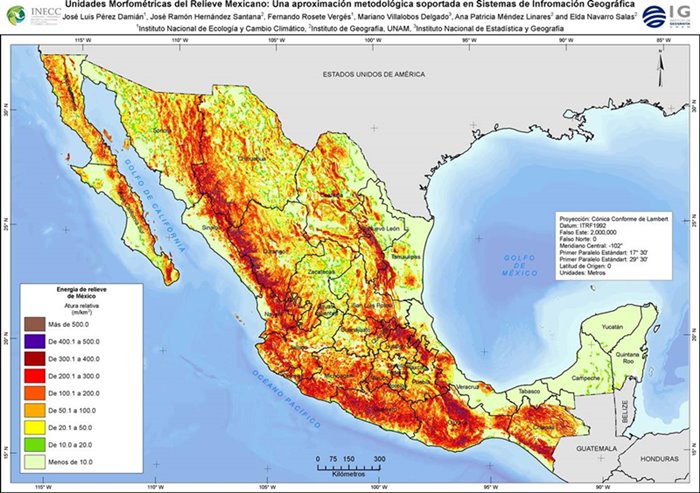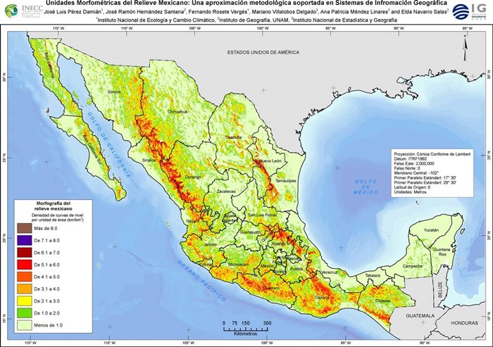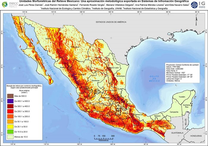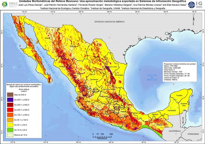 La obtención del mapa de las unidades geomorfométricas del relieve mexicano, a escala 1:250 000, es un producto de la colaboración entre el Instituto Nacional de Ecología (hoy Instituto Nacional de Ecología y Cambio Climático, INECC) de la Secretaría de Medio Ambiente y Recursos Naturales (Semarnat) y el Instituto de Geografía de la Universidad Nacional Autónoma de México (UNAM), generado a partir del análisis espacial de dos de los índices geomorfométricos de relieve: la morfografía y la energía del relieve, apoyado en los software SIG ArcView, ArcGis y ArcInfo, a partir de la información topográfica digital del INEGI (1997), a escala 1:250 000.