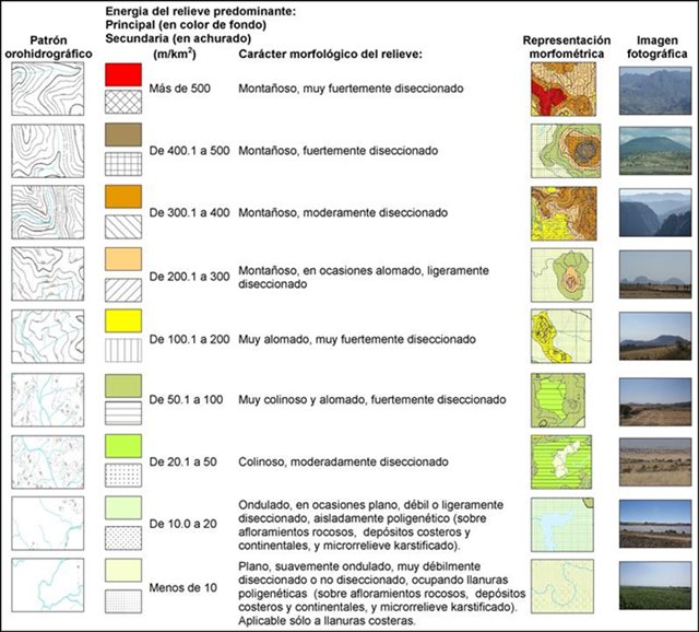 Para la elaboración de la leyenda final se analizaron los intervalos de energía del relieve, ajustándolos al carácter morfológico del relieve, de sus categorías (montañas, lomeríos y llanuras) y subcategorías del relieve (montañas altas, medias, bajas, premontañas, lomeríos grandes y pequeños, y llanuras, altas, medias, bajas y muy bajas) y de su patrón orohidrográfico (Figura 5), así como mostrando una fotografía oblicua del relieve correspondiente a cada tipo y su fragmento cartográfico real.