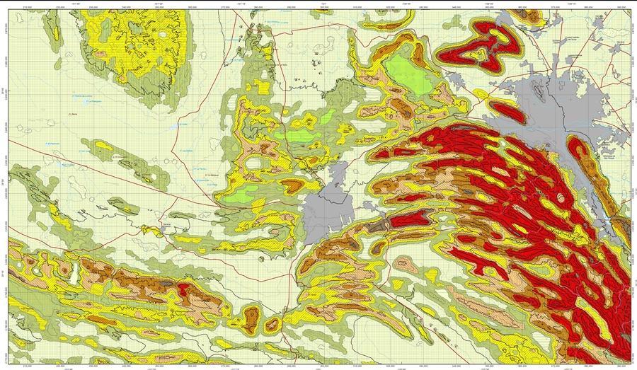 Dado que a la escala 1:250 000 la equidistancia entre curvas de nivel es cada 100 m, se procesaron las curvas de nivel a escala 1:50 000, cuya equidistancia es de 20 m, para determinar con mayor precisión la expresión espacial de la energía del relieve de la zona costera de México, representada mayormente por llanuras planas, onduladas, colinosas y muy colinosas, cuyos valores de incisión erosiva alcanzan desde metros hasta decenas de metros. Sin este paso hubiese sido difícil desarrollar de manera automática el cálculo preciso, pues una interpolación de curvas de nivel, inferiores a 100 m, corregida por una rectificación de experto, indiscutiblemente hubiese introducido errores en su distribución y trazado espacial.