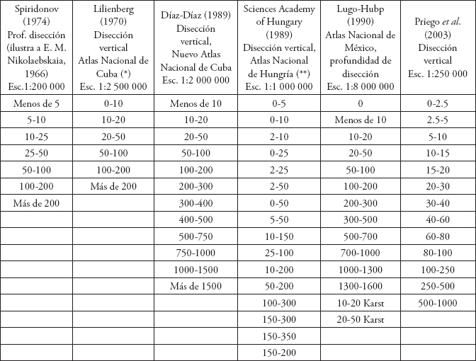 A pesar de que estos estudios no son frecuentes, en dichas obras los intervalos establecidos por varios autores para la disección vertical (Tabla 1) reflejan las características morfográficas y morfológicas del relieve.