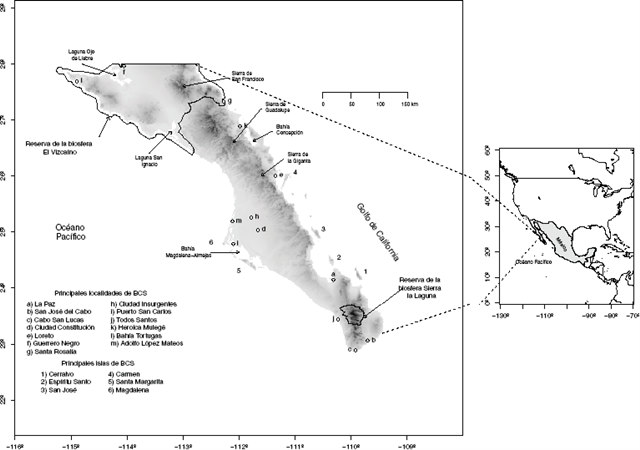 La península de Baja California se encuentra en la región noroeste de México, al norte del Trópico de Cáncer y, por lo tanto, bajo la influencia del cinturón de altas presiones del hemisferio norte. Está influenciada en su costa occidental por la corriente fría de California y en su costa oriental por el agua cálida del Golfo de California. Debido a su origen geológico, la península cuenta con una orografía muy diversa que presenta valles, planicies, lomeríos y sierras elevadas (INEGI, 1991). Hacia la porción meridional de la península, algunos de sus rasgos orográficos más importantes son las montañas de la Sierra de la Giganta, la Sierra de Guadalupe y la Sierra de la Laguna, que da nombre a la Reserva de la Biosfera localizada en el sitio (Figura 1). En términos generales se trata de una zona árida que recibe en promedio alrededor de 200 mm de precipitación al año durante el verano, su principal época de lluvias (INEGI, 1991).
