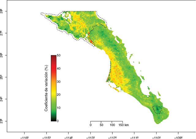 En la Figura 4 se muestran los valores del coeficiente de variación (CV), expresada en porcentaje para cada serie de tiempo de cada pixel. Se observa que más del 98% de los datos tienen ≤ 20% de variación, lo que respalda la consistencia de los datos. Con valores de CV por debajo del 10% destacan nuevamente las áreas de la Sierra de San Francisco, el corredor de la Sierra de la Giganta, la Sierra de Guadalupe y la Sierra de la Laguna, mientras que la porción occidental de mayor influencia oceánica por el Pacífico mexicano presenta los valores más altos de CV, especialmente hacia la parte suroeste de la Reserva de la Biosfera del Vizcaíno.