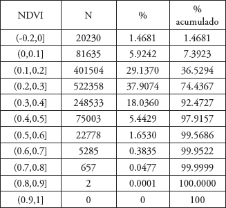 Los productos MODIS se recortaron y reproyectaron del sistema Universal Transversal de Mercator (UTM) al sistema de coordenadas geográficas WGS84; el procesamiento de los datos MODIS se llevó a cabo utilizando el software de programación R (R Core Team, 2015) a través de diferentes librerías. En total se analizaron 345 imágenes de NDVI que, en conjunto, tuvieron la cobertura espacial y temporal requerida.