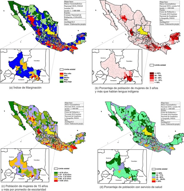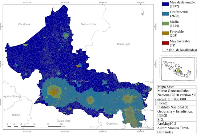 En el país, la población se enfrenta a múltiples factores (sociales, económicos, ambientales, culturales y la falta de accesibilidad a servicios de salud) que acentúan los riesgos que se manifiestan a través de enfermedades y que afectan la utilización adecuada (suficiente y oportuna) de los programas de prevención, tratamiento apropiado y seguimiento. Más del 35.7% de la población mexicana vive bajo condiciones de alta marginación y pobreza, distribuida principalmente en los estados de Veracruz, Puebla, Hidalgo, Michoacán, Guerrero, Oaxaca, Chiapas, San Luis Potosí (SLP), Tabasco, Yucatán y Campeche (Figura 1a). El estado de SLP ocupa el séptimo lugar en marginación, y concentra los grados de marginación muy alto y alto en el sureste de la entidad y en algunos municipios del norte y noroeste (CONAPO, 2010).