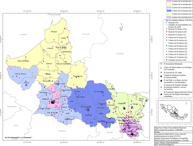 Los servicios de salud en SLP, como en el resto del país, operan de acuerdo a jurisdicciones sanitarias; el estado se organiza en 6 jurisdicciones,2 donde no hay un criterio consistente entre la distribución espacial de la demanda y la distribución espacial de la oferta. Dentro de estas jurisdicciones se distribuyen 300 unidades médicas (UM) de los Servicios Estatales de Salud–Sistema de Protección Social en Salud (slpsalud-SPSSA), que tienen disponibles los servicios públicos del Programa nacional de prevención integral y control del CC en el estado de SLP para cubrir el 60.3% de la población objetivo.3 En la Figura 2 se observa la distribución de estas 300 UM. Actualmente los recursos para la atención a las mujeres usuarias potenciales (Servicios de Salud, 2016) son: