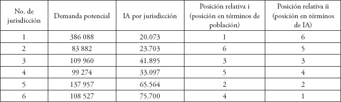 Accesibilidad por jurisdicción. Las jurisdicciones 1, 2 y 4 tienen una accesibilidad muy desfavorable para la demanda potencial, menos de la mitad que la mejor posicionada, la jurisdicción 6 (Cuadro 1).