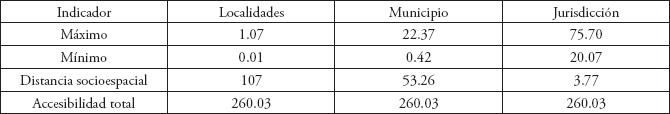 Al comparar la desigualdad de acceso entre los diferentes niveles de agregación territorial se identifican contrastes muy evidentes (Cuadro 2). El cociente entre el lugar mejor posicionado y el menos favorecido (valor mínimo del indicador IA) nos brinda la distancia social o brecha de desigualdad. Este concepto había sido referido por Garrocho (1992:15, 41); sin embargo, no se había demostrado empíricamente, lo que fue posible lograr en este trabajo. Por ejemplo, en el caso de la accesibilidad de las localidades, la mejor posicionada registró una ventaja de 107 veces contra la de mayor desventaja. A nivel municipal, esta distancia socioespacial es de 53 veces mientras que por jurisdicción es de 3.7. La agregación de la información puede ocultar realidades muy dispares en su interior, como lo muestran los datos; de ahí que se deba considerar la dimensión espacial en la planeación de los servicios y no solo aspectos normativos de dotación.