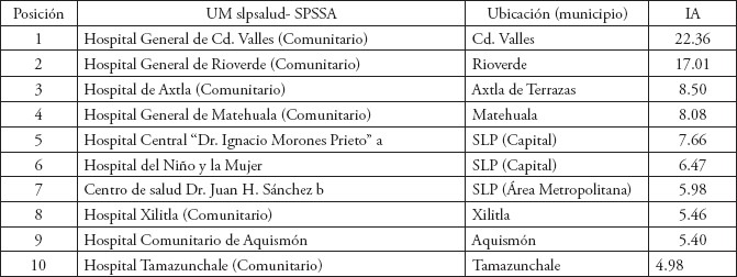 En el Cuadro 3 se muestran las UM mejor posicionadas. Las que ocupan los primeros cuatro lugares están localizadas fuera de la capital. Las posiciones 5, 6 y 7 se ubican en el área metropolitana del estado de SLP.