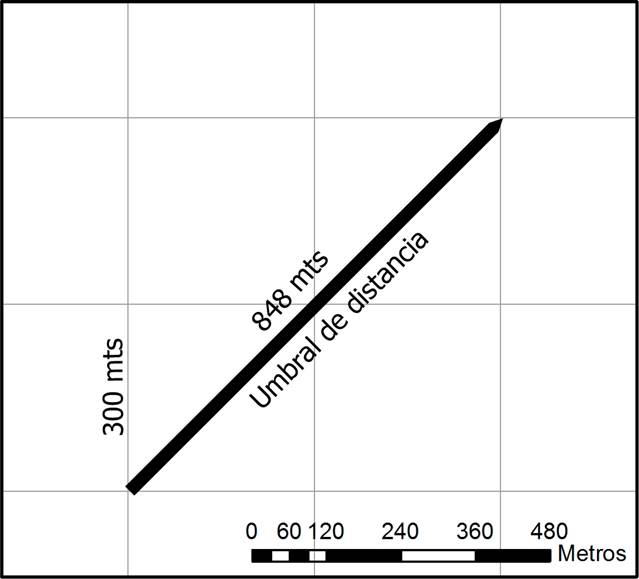 Para definir el umbral de distancia se siguió el siguiente razonamiento: la literatura internacional reporta evidencia acerca de la velocidad preferida promedio de marcha (velocidad cómoda para caminar) de la población mayor, según Coffin y Morrall (1995) en sus estudios en Calgary, Canadá; no obstante, se observa un rango de velocidad preferida de marcha que va de 40 centímetros por segundo a 1.2 metros por segundo. Por otro lado, King et al. (2003), en su trabajo acerca de Nueva Jersey, reportan que el tiempo máximo promedio de marcha cómoda entre la población mayor es de 20 minutos. Si se comparan estos datos, el alcance espacial, es decir, el radio de acción o espacio cotidiano que se cubre caminando en un contexto urbano de la población de 65 años y más va de 480 metros a 1.4 kilómetros.