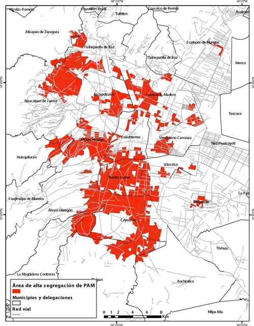 Una de las principales manifestaciones socioespaciales del envejecimiento urbano es la segregación residencial, que afecta notablemente la calidad de vida (incluso la salud y la mortalidad) de la población mayor (Salgado y Wong, 2006). Recientemente, Garrocho y Campos (2016) demostraron la existencia de segregación espacial de la población mayor en el lugar más poblado de México, el AMCM, e identificaron zonas prioritarias de atención, no para eliminar la segregación, sino para modularla, ya que la segregación no es inherentemente negativa. Estos autores evitaron utilizar métodos tradicionales no espaciales para medir la segregación, ya que son inadecuados para estimar el fenómeno (Reardon y O´Sullivan, 2004; Garrocho y Campos, 2013), y se inclinaron por aplicar métodos genuinamente espaciales, que son más robustos en términos conceptuales y metodológicos, y permiten no sólo calcular la segregación, sino jerarquizar zonas-objetivo de políticas públicas en el espacio intraurbano (Garrocho, 2015).