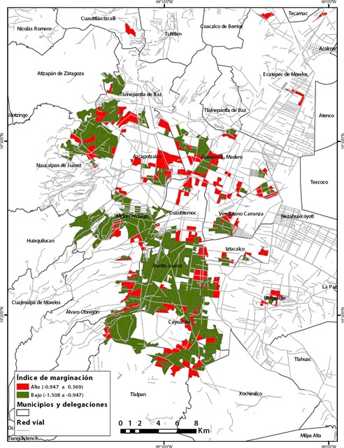 Para analizar los efectos que tiene la multifuncionalidad, como el factor de capital espacial, se retomó la información sobre índices de segregación para adultos mayores presentada por Garrocho y Campos (2016) y el índice de marginación (Conapo, 2017) en el AMCM. Esta información ayudó a conocer los grados de ambos índices y la delimitación de áreas de atención prioritaria en la ciudad.