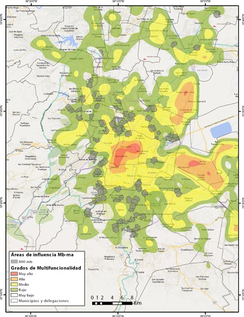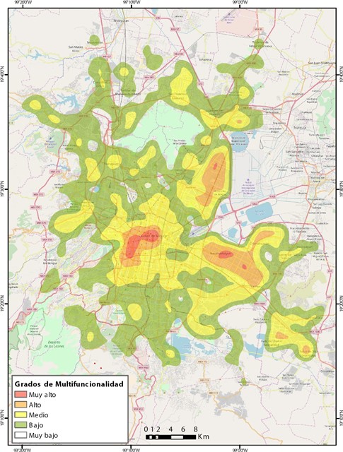 Al realizar el análisis de multifuncionalidad para el AMCM, se observa la existencia de tres zonas con alto grado de multifuncionalidad muy bien definidas: una en el centro de la ciudad y dos ubicadas en la periferia. La zona más importante es la del centro de la ciudad, que comprende las colonias Centro, Guerrero, Obrera, Doctores, Roma Norte, Roma Sur, Hipódromo, Del Valle Norte, Del Valle Centro, Nápoles, Escandón, Hipódromo Condesa, Condesa, San Pedro de los Pinos, Bosque de Chapultepec, Anzures, Cuauhtémoc, San Rafael, Santa María la Ribera, Tlaxpana, Agricultura, Polanco, Granada y Anáhuac.