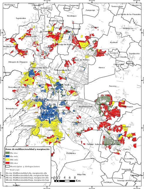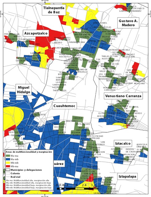 En la categoría Ma-ma existe un comportamiento atípico, pues inicialmente se pensaría que las zonas de alta marginación siempre estarían relacionadas con una baja multifuncionalidad y que deberían estar localizadas en la periferia, sin embargo, los resultados muestran algunas áreas de alta multifuncionalidad y alta marginación como las colonias Doctores, Obrera, Buenos Aires y Peralvillo, en la delegación Cuauhtémoc; San Miguel Chapultepec, en Miguel Hidalgo; Moderna, en Benito Juárez, y Tolteca, en Álvaro Obregón. No obstante su índice de marginación alto, se ve compensado por un mayor capital espacial.