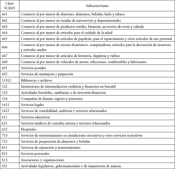 Con la creación de un perfil de los tipos de bienes y servicios que los adultos mayores utilizan en su vida cotidiana, se seleccionaron las unidades económicas que, según el Sistema de Clasificación Industrial de América del Norte (SCIAN), se encuentran censadas y localizadas con coordenadas espaciales en el Directorio Estadístico Nacional de Unidades Económicas (Inegi, 2016). Este perfil incluyó las unidades económicas de 21 subsectores y tres ramas de actividad (Tabla 1).