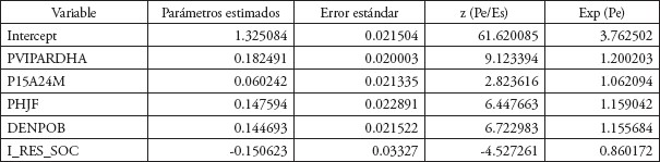 Enseguida se presentan los resultados de la no estacionariedad de los robos a casa habitación. En la Tabla 1 se muestran los parámetros estimados de la regresión global y se observa que únicamente la variable índice de rezago social tiene un efecto negativo. Todos los parámetros son estadísticamente significativos con α = 0.5.