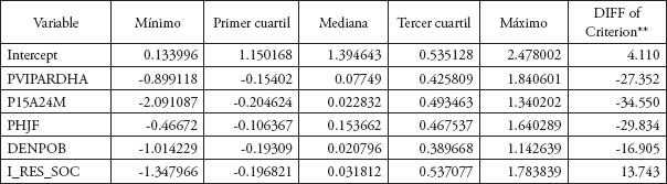 En la Tabla 2 se resumen los valores de cinco indicadores de la distribución de los coeficientes del modelo geográficamente ponderado obtenidos después de las 615 regresiones, se aprecia que todos los valores de las variables independientes tienen un recorrido de valores negativos a positivos, por lo tanto, permite deducir que los valores varían de manera relevante a escala intraurbana; por ejemplo, el coeficiente de la variable viviendas particulares deshabitadas tiene un valor mínimo de -0.899118, lo cual indica el efecto negativo en algunas zonas de la ciudad, en contraste, el valor máximo es de 1.840601.
