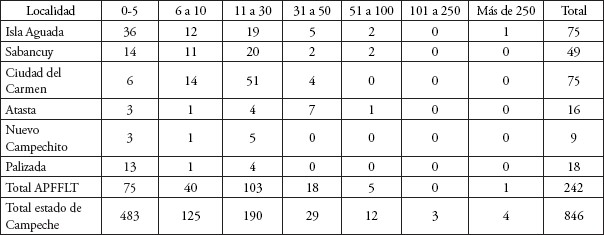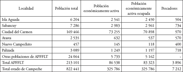 El APFFLT registra 285 localidades pero sólo nueve sobrepasan los mil habitantes. Las guías de entrevistas se aplicaron en los entes de mayor población, importancia pesquera y número de puertos: Ciudad del Carmen (se aplicaron 10 cuestionarios), Sabancuy (10), Isla Aguada (10), Nuevo Campechito (10) y Atasta (9).