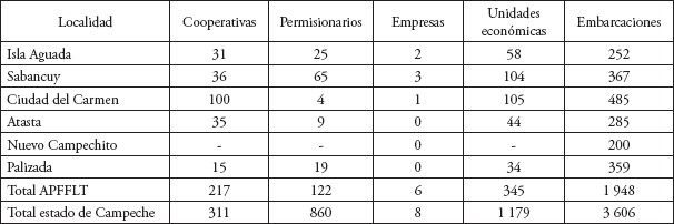 La CONAPESCA-Campeche (2016) identifica dentro del ANP, 345 unidades económicas inscritas en el Registro Nacional de Pesca y Acuacultura, aunque los datos que maneja el Directorio Estadístico Nacional de Unidades Económicas las rebaja a 242: un llamativo 30% menos (Tablas 2 y 3), dato que demuestra problemas estadísticos que debieran solventarse en pro del futuro del sector.