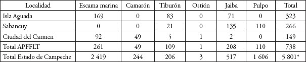 El APFFLT dispone de una población económicamente activa ocupada de poco más de 83 000 personas aproximadamente, y el 5% son pescadores (INEGI, 2010). Es menester considerar que la CONAPESCA-Campeche1 estima en 3 896 los pescadores ribereños que trabajan legalmente en el APFFLT (Tabla 1), lo que representa más de la mitad de los presumidos en el estado (7 212). El Registro Nacional Pesquero y Acuícola tiene inscritas en el ANP 1 948 embarcaciones menores sobre un total estatal de 3 606 (Tabla 2). Debido a la normatividad que rige al ANP, no existen concesiones pesqueras, por tanto la pesca comercial ribereña se realiza únicamente por medio de los permisos (suelen renovarse cada dos años); su número permanece estable pues la Carta Nacional Pesquera prohíbe aumentar el esfuerzo pesquero.