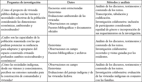 La tercera etapa consistió en la elaboración de una encuesta semi estructurada, una guía de entrevistas y una matriz de medición térmica y de humedad. La encuesta incluyó 35 preguntas distribuidas en siete secciones: datos poblacionales, demografía, perfil socio-económico, rol del participante en la familia, participación comunitaria, uso y acceso a los recursos naturales, y roles de género. La entrevista constó de dos partes: la primera indagó las principales experiencias durante el reasentamiento, conflictos comunitarios, dinámicas familiares, formas de usos y gestión de recursos naturales, convivencia comunitaria y las visiones a futuro. La segunda parte se enfocó en las familias indígenas para conocer sus apreciaciones de la vivienda moderna y contrastarlas con su visión kichwa de vivienda. Finalmente, la matriz de medición ambiental tuvo dos secciones: en la primera se detallaron los parámetros cuantitativos de temperatura y humedad y en la segunda sección se incorporaron preguntas para conocer las percepciones diarias de las familias respecto de las condiciones materiales y espaciales de las viviendas. De esta manera, el estudio del urbanismo y el paisaje indígena resulta de la interrelación de contribuciones metodológicas desarrolladas colectivamente con familias indígenas y de los aportes académicos generados en colaboración con grupos minoritarios.