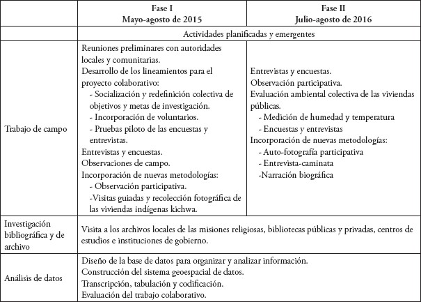 En esta investigación, el trabajo de campo se dividió en dos fases realizadas en mayo-agosto 2015 y junio-agosto 2016, con estancias que oscilaban entre 5 a 7 días para cumplir con los diferentes objetivos. En la primera fase se desarrolló una visita al área de trabajo, registro fotográfico, entrevista con los principales líderes y lideresas de la comunidad, y búsqueda de colaboradores y voluntarios interesados en participar en el proyecto de investigación. Además de buscar una vivienda para establecerme durante la investigación, contacté y coordiné con autoridades oficiales y comunitarias para procurar el buen desarrollo del estudio. En esta fase se llevó a cabo el registro fotográfico, las entrevistas y encuestas semi estructuradas. La segunda fase tuvo como objetivo ampliar la colección fotográfica, así como completar las entrevistas, las encuestas y las mediciones ambientales del modelo de vivienda pública.