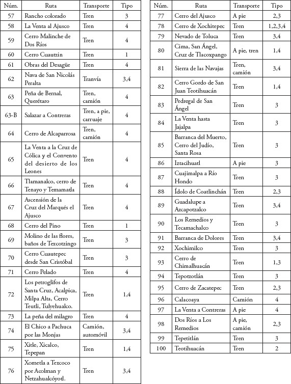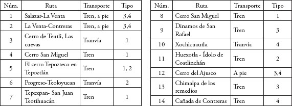 Centrando la atención en las primeras cien excusiones, hemos hecho una clasificación temática en función a la ruta y los destinos propuestos en cada salida (Tabla 1). Se pueden identificar cuatro tipos de destinos excursionistas: