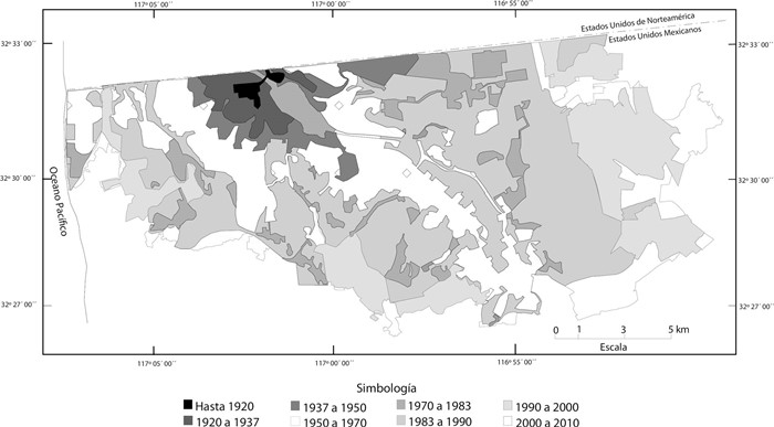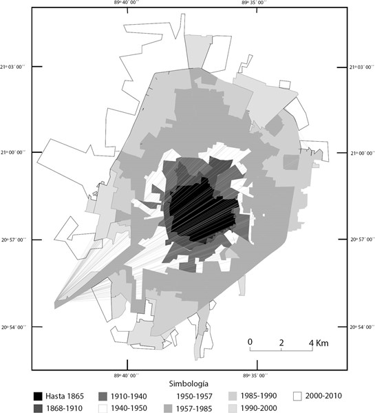 Diversos autores han elaborado descripciones y análisis de la conformación y evolución de las ciudades incorporando un enfoque histórico (Kostof, 1991; Quiroz, 2007; Borsdorf, 2003; Salamanca, 1999; Álvarez, 2011). Esto ha generado la reflexión y construcción de paradigmas con el fin de describir las características y evoluciones del espacio urbano considerando la historia presente de los diversos espacios según el momento o época en que inició la construcción de dicho espacio (Carballo, 2007). El presente ejercicio se basa en tal concepción. La propuesta que se plantea a continuación es analizar las diferencias intraurbanas a partir del tiempo al que corresponde el espacio, es decir, estudiar el espacio urbano en función de su temporalidad. Para ello se dividió el espacio interno de las seis ciudades por periodos de crecimiento. No fue posible manejar periodos de crecimiento idénticos entre todas dado que los mapas de crecimiento de las ciudades manejan periodos diferentes (véanse Figuras 1 y 2). El procedimiento para calcular los indicadores por periodo de crecimiento de la ciudad fue el siguiente: se agruparon aquellas AGEB cuya superficie queda completamente incluida dentro de un determinado periodo de crecimiento; para aquellas AGEB que quedaron ubicadas en dos o más periodos de crecimiento se calculó la proporción de superficie que le corresponde de dicho AGEB a cada zona de crecimiento, distribuyendo el valor de las variables del censo según la proporción de la superficie.7 De esta forma, tenemos el valor agregado de la variable por zona de crecimiento, como es posible observar en la Figura 1 y el Cuadro 1 para el caso de la ciudad de Mérida, y en la Figura 2 y el Cuadro 2 para el caso de Tijuana.