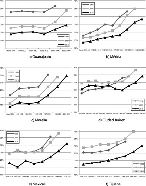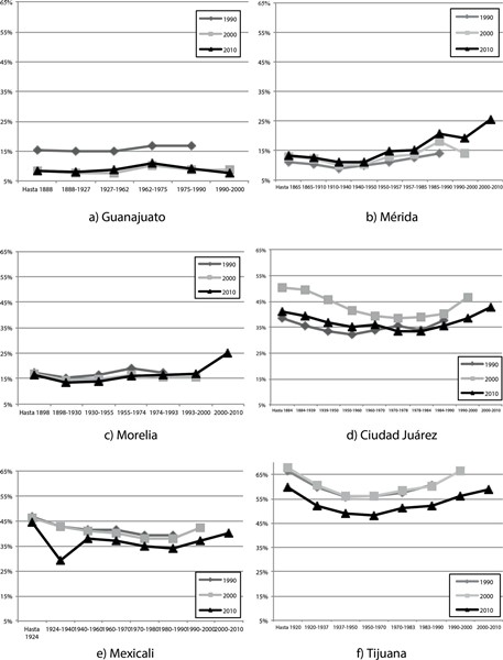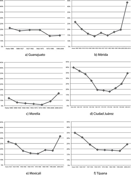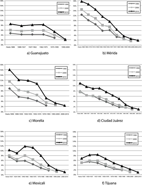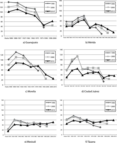 Dicha curva de densidad casi mantiene las mismas pendientes en los tres tiempos analizados (1990, 2000 y 2010), pero con dos variantes importantes a recalcar: entre los datos censales de 1990 y 2010, la densidad disminuye en los espacios viejos, hasta aquellos construidos entre 1950 y 1970; segundo, la densidad aumenta en los espacios construidos entre 1980 y 2000 (Figura 3). Es decir, entre 1990 y 2010 la disminución de densidad en el centro histórico (o los espacios más antiguos) de las seis ciudades nos indica que han perdido residentes, convirtiéndose en zonas de expulsión o rechazo. Por ejemplo, el espacio urbano de Ciudad Juárez, construido hasta 1939, disminuyó su población en un 40% de 1990 al 2010; para Morelia, la población de la zona urbana que corresponde hasta 1930 decreció en un 36% entre 1990 y 2010; en Mexicali, en el espacio urbanizado hasta 1924 disminuyó su población en un 35%; Mérida, en su espacio construido hasta 1910, bajó en un 32%; Tijuana, en su espacio hasta 1937, disminuyó en un 25%, al igual que Guanajuato, en el espacio urbano construido hasta 1927. Por otro lado, las zonas de las seis ciudades que se construyeron a partir de 1990 son las únicas que han incrementado de densidad de población.