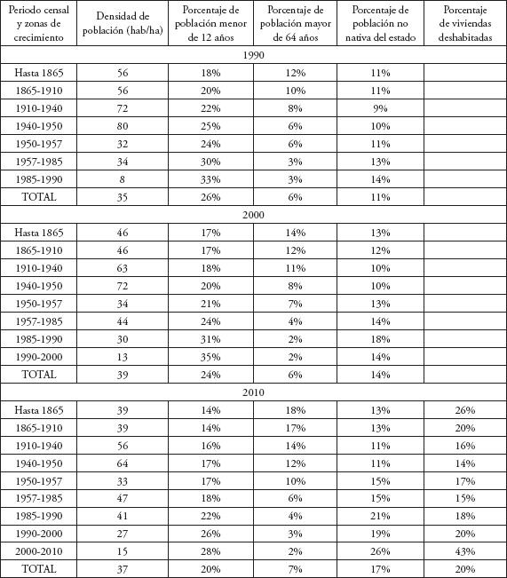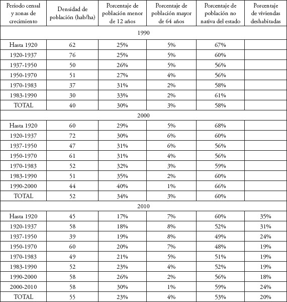 Como cuarto y último punto, a partir de las variables analizadas, podemos afirmar que no existen diferencias significativas entre el crecimiento de las últimas décadas de las ciudades coloniales y las fronterizas. De hecho, se percibe mucha similitud en el comportamiento de las variables, tanto en el espacio urbano como en el tiempo. Resulta interesante identificar similares patrones de evolución reciente del espacio urbano entre ciudades con distintos orígenes de desarrollo urbano. Por ejemplo, el envejecimiento de la población y su relación con la temporalidad del espacio urbano pareciera ser una situación que se ha dado constantemente en nuestras ciudades (Narváez, 2012). Sin embargo, la disminución de la densidad de población, aunada a la presencia de vivienda abandonada en los espacios con más de 60 años de existencia, pueden ser señales de un espacio urbano en proceso de estancamiento económico y social.