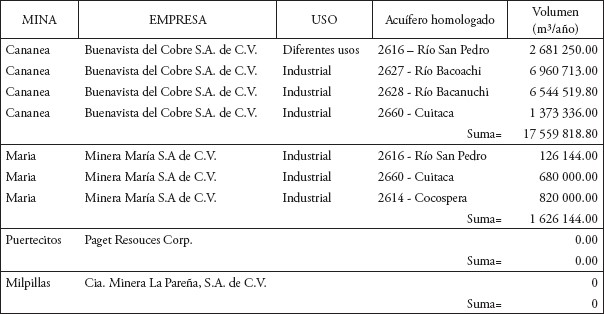 En los resultados obtenidos se observó una falta de correspondencia espacial entre los concesionarios de pozos subterráneos y las empresas mineras indicadas por el Servicio Geológico Mexicano, por lo que se decidió no emplear esta información en el presente estudio. La mina Cananea, de la empresa Buenavista del Cobre, tiene registrados pozos de explotación de agua subterránea como de uso industrial y diferentes usos, por lo que se duda si el volumen importante de explotación registrado como de diferentes usos se emplea total o parcialmente en actividades de minería; además, es una práctica habitual que adicionalmente a los pozos en explotación adscritos a las empresas mineras, estas tienen acceso a otros pozos de ejidos cercanos mediante acuerdos privados vigentes, lo cual no queda registrado en el REPDA.