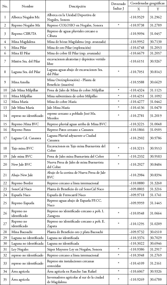 Adicionalmente, se seleccionaron 11 diferentes áreas clasificadas en tres grupos: 1) excavaciones de minas de cobre, 2) presas de jales de minas de cobre, y 3) represos o embalses naturales. Estas áreas fueron definidas previamente mediante la fotointerpretación de imágenes satelitales de Google Earth y con la información de localización de minas del Servicio Geológico Mexicano.