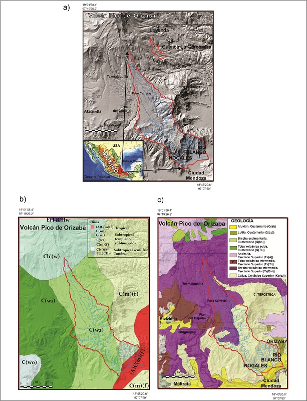 La cuenca del río La Carbonera se encuentra ubicada a 18°58’45.78”-18°49’26.83” N y 97°15’34.62”-97°08’7.44” O, en el flanco sureste del volcán Pico de Orizaba, México (Figura 1a). El Pico de Orizaba es la montaña más alta de México (5675 msnm), situado en la sección oriental de la provincia volcánica llamada Faja Volcánica Transmexicana (FVTM). El río La Carbonera es un afluente del río Blanco, que desemboca en el Golfo de México. La cuenca se encuentra en el estado Veracruz y cubre un área de 71.9 km2, con un rango de elevación de 1224 a 1345 msnm. Los patrones de drenaje de la cuenca reflejan su relación con la pendiente y con la geología. La parte alta de la cuenca, donde predominan las rocas volcánicas, presenta una red fluvial paralela, característica de áreas de pie de monte donde las fuertes pendientes imponen la dirección del flujo de los escurrimientos. Algunos de los ríos secundarios reflejan también un control estructural (presencia de coladas de lava y/o fallas) al tener un patrón de drenaje rectangular. La parte media y baja de la cuenca, donde predominan las rocas sedimentarias, presentan un patrón de dendrítico y paralelo. El proceso es esencialmente de erosión. También en la cuenca, las pendientes de las laderas están controladas por el tipo de rocas volcánicas o sedimentarias existentes; así, por ejemplo, los escarpes de más de 45° consisten en coladas de lava. Laderas con pendiente fuerte, de entre 32 y 45° presentan intercalaciones de conglomerados cementados, aglomerados y depósitos de lahares. En las partes bajas de la cuenca, depósitos sedimentarios de calizas y lutitas, constituyen laderas de hasta 32°. Administrativamente, el área de estudio pertenece a los municipios de Ixhuatlancillo, La Perla, Maltrata, Mariano Escobedo, Nogales y Río Blanco.