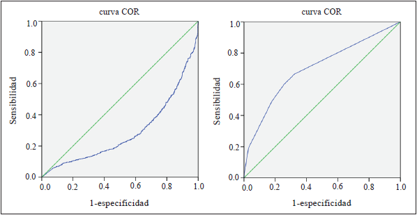 El área bajo la curva de la característica operativa del receptor (COR) se calculó usando el programa SPSS, para lo cual se consideraron todos los pixeles del área de estudio, asignando a todos los deslizamientos como positivos y el resto como negativos. El área bajo la curva se define trazando en un gráfico bidimensional pares de sensibilidad (razón de pixeles positivos verdaderos) y especificidad (razón de pixeles falsos positivos) (Figura 2). La razón de pixeles positivos verdaderos es el número de pixeles correctamente clasificados en la categoría de deslizamiento dividido por el número total de pixeles de deslizamiento real y la razón de pixeles falsos positivos es el número de pixeles clasificados incorrectamente de la categoría “sin-deslizamiento” dividido por el número total de pixeles reales “sindeslizamiento” (Yesilnacar y Topal, 2005; Lee, 2005; Fawcett, 2006; Namdi y Shakoor, 2010; Günther, Van Den Eeckhaut, Malet, Reichenbach y Hervás, 2014). Si el modelo es perfecto, el área bajo curva gráfica tiene un valor de 100%, mientras que un valor cercano al 50% indica inexactitud en el modelo (Fawcett, 2006; Nandi y Shakoor, 2010; Günther et al., 2014).