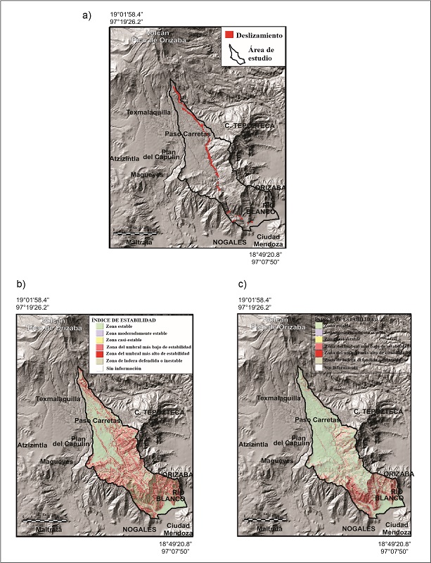 Los deslizamientos se identificaron mediante trabajo de campo y la fotointerpretación de dos series de fotos aéreas para crear un mapa de inventario de deslizamientos (Figura 3a). Las fotografías aéreas cubren un período de 14 años, a partir de 1994, a escala de 1:20 000 al 2008 a escala de 1:10 000. El trabajo de campo se llevó a cabo durante diferentes períodos al año, desde 2013 hasta 2015, a lo largo del río principal y en algunos tributarios. Deslizamientos superficiales se cartografiaron en campo y en gabinete de acuerdo con los criterios de la División de Prácticas Forestales del estado de Washington (Washington State, DNR, 2006). Estos criterios simplifican el sistema de Cruden y Varnes (1996) y Wieczorek (1984) al listar sólo la clasificación primaria de un deslizamiento determinado. Todos los deslizamientos superficiales fueron digitalizados en el SIG de ArcGIS, y se construyó la base de datos geoespacial de los mismos. Los atributos de localización, geotecnia, tamaños, y tipos de los deslizamientos se colectaron en el SIG. La digitalización de los deslizamientos se llevó a cabo de manera directa en pantalla. A cada deslizamiento se le dividió en tres partes (cabecera, área de evacuación y depósito), cuando estas eran existentes en las fotografías aéreas o en el campo. Para el modelado susceptibilidad y su análisis de eficiencia, sólo se consideraron las cabeceras de los deslizamientos superficiales. La cantidad de verificación de campo fue del 15% de todos los deslizamientos. El trabajo de campo y la fotointerpretación permitieron la representación cartográfica de 236 deslizamientos superficiales.