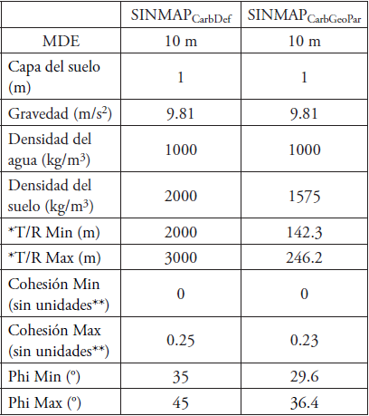 El modelado de la susceptibilidad a deslizamientos en las laderas fue hecho con SINMAP. El modelo combina la teoría del Factor de Seguridad del modelo de estabilidad de pendiente infinita con un modelo hidrológico para predecir potenciales áreas de deslizamiento superficiales (Montgomery y Dietrich, 1994; Pack et al., 2001). El modelo usa datos topográficos (pendiente, área de captación y dirección de flujo agua superficial), hidrográficos (transmisividad del suelo, precipitación total) y variables del suelo (densidad, ángulo de fricción interna y cohesión). Estos datos provienen de la capa de suelo inestable dentro de la cabecera para producir un índice de estabilidad (SI) (Pack et al., 2001). Este índice expresa la estabilidad del terreno utilizando seis clases subjetivas: de 0 > SI (“inestable”); 0.5 > SI > 0.0 (“del umbral más alto de estabilidad”); 1.0 > SI > 0.5 (“del umbral más bajo de estabilidad”); 1.25 > SI > 1.0 (“casi estable”); 1.5 > SI > 1.25 (“moderadamente estable”), y SI > 1.5 (“estable”) (Pack et al., 1998, 2001). Las propiedades geotécnicas requeridas para correr el modelo y generar dos escenarios se establecieron con base en 1) valores geotécnicos pre-establecidos por el sistema (aquí referido como SINMAPCarbDef) y 2) valores geotécnicos específicos del área de estudio (aquí referido como SINMAPCarbGeoPar) (Tabla 2).