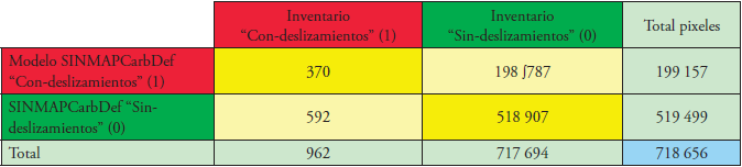 Para evaluar el desempeño de los mapas de susceptibilidad creados con SINMAP, se realizó un análisis cualitativo (visualmente) y cuantitativo por medio de su comparación con el inventario de deslizamientos. La comparación se realizó mediante el uso de superposiciones en el SIG y matrices de confusión bajo el sistema LOGISNET (Legorreta y Bursik, 2009) y el área bajo la curva de la característica operativa del receptor (COR) obtenida en el programa estadístico SPSS. La superposición visual resultante de los modelos y el inventario de deslizamiento en el SIG se llevó a cabo para permitir, con base en el conocimiento del investigador y de la evidencia empírica, describir si los modelos tuvieron similares resultados o no, si hubo cambio en los patrones de predicción del modelo, y si estos reflejan las condiciones topográficas más que la geomorfología de los deslizamientos. A fin de facilitar la comparación numérica entre el inventario y los modelos se utilizó un esquema de dos clasificaciones (“con-deslizamiento” y “sin-deslizamiento”) tanto para el inventario como para los dos mapas de susceptibilidad de SINMAP. Las seis clases del SI se clasificaron en: área “con-deslizamiento”, que incluye las clases inestable, de umbral más alto y de umbral más bajo de inestabilidad, y área “sin-deslizamientos”, que incluye las clases estable, moderadamente estable y casi estable. La superposición numérica sirvió para calcular la precisión y la eficiencia de los modelos mediante el uso de la matriz de confusión (Tabla 3).
