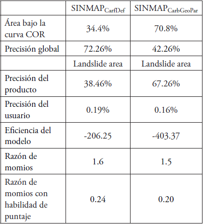 Cuantitativamente, las técnicas de comparación permitieron evaluar la predicción y eficiencia del modelo cartográfico-hidrológico (Tabla 4). El COR indica una mayor capacidad predictiva para SINMAP con datos de calibración geotécnica (70.8%) y una pobre capacidad de predicción mediante el uso de parámetros predefinidos por el sistema (34.4 %). La alta precisión global de SINMAPCarfDef (72.26%) en comparación con SINMAPCarbGeoPar (42.26%) se explica por el hecho de que la precisión global pondera más la categoría más predominante, en este caso la clase de “sin-deslizamientos”. Lo mismo ocurre con las razones de momios, quienes son fuertemente influenciadas por la clase más predominante. Por su parte, la precisión del producto muestra que la predicción de SINMAPCarbGeoPar tiene una mejor coincidencia (67.26%) con el mapa de inventario a deslizamientos en comparación con SINMAPCarfDef (38.46%). En otras palabras, si supiera que un área en particular está afectada por deslizamientos (y se ha verificado en campo), la probabilidad de que el modelo identifique correctamente ese pixel como deslizamientos sería del 67.26% y del 38.46% usando SINMAPCarbGeoPar y SINMAPCarfDef, respectivamente. Esta “buena concordancia” de SINMAP con el modelo de inventario de datos geotécnicos se debe a una mayor sobre-predicción. La sobre-predicción conduce a que más áreas “sindeslizamientos” se clasifiquen incorrectamente como deslizamientos superficiales en el modelo. Ambos modelos sobre-predicen, como se muestra por su bajo porcentaje de precisión del usuario y valores negativos en la eficiencia del modelo.