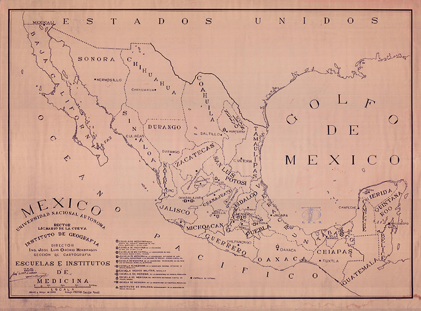 El título del mapa es Escuelas e Institutos de Medicina y lleva la firma de José Luis Osorio Mondragón, director del Instituto de Geografía y se indica el nombre de Mario de la Cueva, rector de la Universidad Nacional Autónoma de México. Resalta la actuación del jurista en este trabajo, quien estaba a unos días de dejar la rectoría de la Universidad. Por tanto, el mapa lo mandó hacer la máxima autoridad universitaria y era una nueva forma visual de hacer presente el espacio médico de una comunidad intelectual con una larga trayectoria académica dentro de la Universidad y hondas herencias en el mundo colonial.