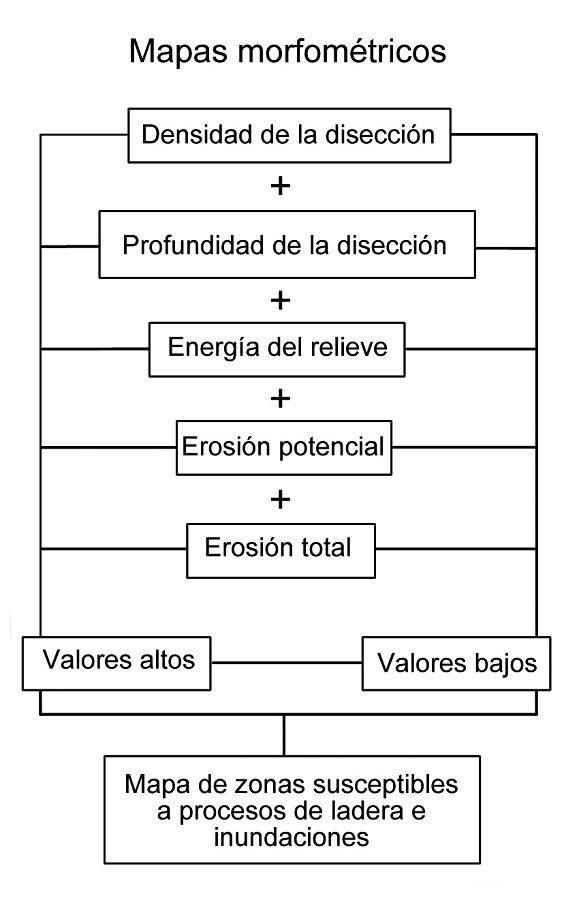 Los métodos morfométricos utilizados siguen los criterios de Simonov (1985), Lugo (1988) y Zamorano (1990). Los parámetros elegidos en este análisis son: altimetría, inclinación del terreno, densidad de la disección, profundidad de la disección, energía del relieve, erosión potencial y erosión total. La interpretación integral de este tipo de cartografía, permitió entender los mecanismos de ocurrencia de inundaciones y procesos de ladera, y, del mismo modo, zonificar los terrenos que favorecen su existencia.