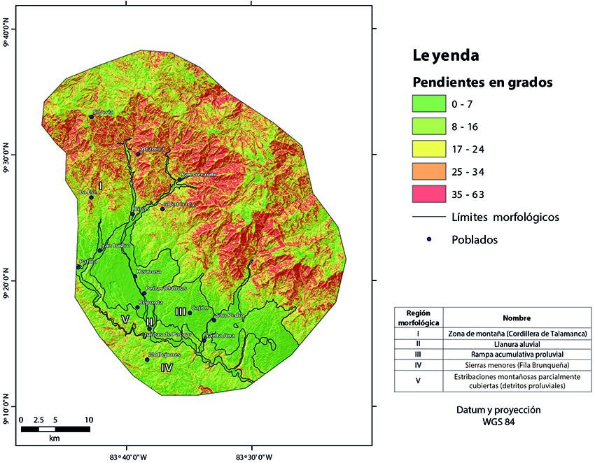 Este documento simplifica la información topográfica, muestra la espacialidad y características de los contrastes altitudinales. Cuando esta información se sobrepone con el mapa de inclinación del terreno y se analiza junto con información geológica, es posible establecer unidades geomorfológicas; cada una de ellas define territorios similares en cuanto a génesis, morfología y dinámica. De este proceso resultaron las siguientes regiones morfológicas: zona de montaña (Cordillera de Talamanca), sierras menores (Fila Brunqueña), llanura aluvial, rampa acumulativa proluvial y estribaciones montañosas cubiertas por detritos proluviales (Figura 3).