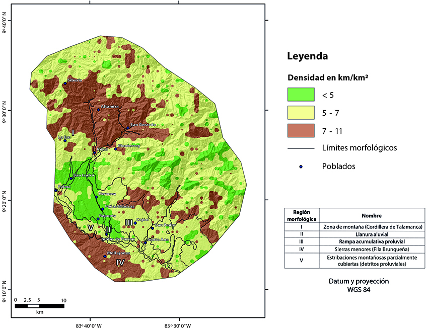 Los índices <11 km/km2 se localizan en relieves de formación reciente y de origen exógeno acumulativo (abanicos y llanuras aluviales). Los valores entre 12 y 25 km/km2 a manera de una franja de transición entre la zona de montaña y los relieves acumulativos. El sustrato donde se emplazan estos valores es de ígneo intrusivo (granitoides), cuya morfología se ha suavizado por la existencia y desarrollo de cortezas de intemperismo. El último rango (26-45 km/km2) se presenta en la zona cumbral y en las laderas altas de la vertiente pacífica y caribeña, en donde predominan los terrenos rocosos abruptos, lo que dio como resultado una morfología variada. Hay que mencionar que las cubiertas detríticas (cortezas de intemperismo) no son representativas, debido a que fueron removidas por procesos fluviales, gravitacionales y glaciares.