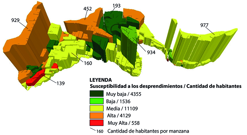 Finalmente, este trabajo pretende colocar en perspectiva el impacto actual y futuro de los desprendimientos de rocas en el bienestar y calidad de vida de los residentes, así como la incidencia que este proceso geomórfico puede tener en un desarrollo local sustentable, de acuerdo con un escenario geográfico similar al investigado. Para lograrlo, se le asignó a cada manzana el nivel de susceptibilidad predominante y se verificaron la cantidad de viviendas y habitantes, según INEGI (2010) (Figura 11 y 12). Es oportuno aclarar que los límites de susceptibilidad a los desprendimientos o, en general, a cualquier fenómeno o proceso de carácter natural, no necesariamente guardan correspondencia con los límites urbanos, como las manzanas. Es así como las escenas de las Figuras 11 y 12 solo representan la susceptibilidad predominante en el perímetro de cada manzana y pierden pequeños pixeles de otras categorías de susceptibilidad hacia su interior.