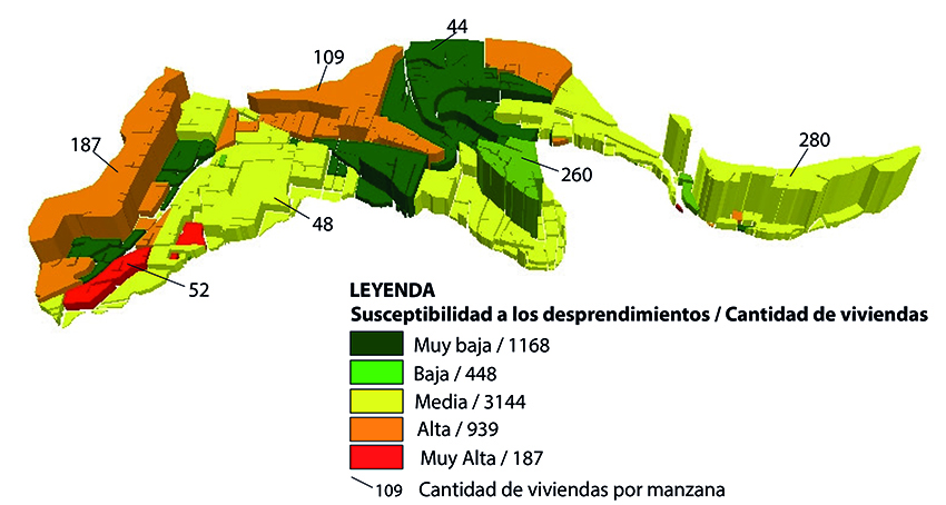 Este estudio revela 1 126 viviendas en condiciones de alta y muy alta susceptibilidad a los desprendimientos de rocas (Figura 12), cuyas zonas presentan condiciones muy desfavorables para el desarrollo urbano, ya sea de viviendas o de infraestructura de gran porte, como hospitales, escuelas, plazas comerciales u otras. Incluso, la zona de susceptibilidad media, donde actualmente se emplazan 3 144 viviendas, debe ser manejada con estricta precaución, especialmente en la ejecución de obras que exijan taludes, con el ulterior debilitamiento de las estructuras adyacentes.