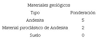 Para definir la susceptibilidad litológica (SL) fue necesario el levantamiento geológico mediante trabajo de campo, para lo que se visitaron 51 puntos, lográndose un punto de reconocimiento geológico por cada 1.5 km2, aproximadamente. El mapa geológico derivado permitió conocer la distribución espacial de los diferentes tipos de materiales (suelo o roca). Posteriormente, y con apoyo del inventario realizado en la primera fase, se distinguieron los tipos de materiales susceptibles a los desprendimientos rocosos en el pasado. Otro elemento, aportado por el levantamiento geológico, se vincula a rasgos estructurales, como la yacencia de las rocas, expresada mediante el ángulo de buzamiento y la dirección del buzamiento (S0), y de igual forma para los planos identificados de fallas. En la Tabla 1 se muestra la relación de materiales geológicos con sus niveles de influencia a la ocurrencia de desprendimientos de rocas. El nivel de influencia (ponderación) fue determinado a través el análisis de inventario de movimientos de laderas, realizado en campo y mediante la experiencia acumulada en investigaciones anteriores, donde se evaluaron materiales geológicos de comportamiento geomecánico similar (Díaz de Terán et al., 1997; Corominas, 2006; Arango, 2014; Mergili, Marchant y Moreiras, 2015;Galindo y Alcántara-Ayala, 2015).
