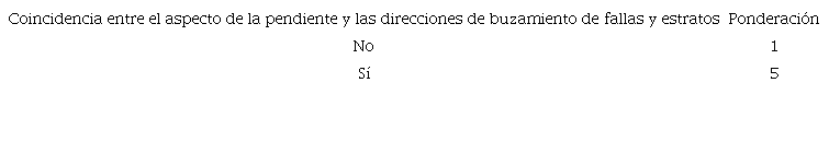 Por su parte, la susceptibilidad geomorfológica (SG) consideró dos indicadores: 1) las pendientes del terreno, en grados, y 2) la posible coincidencia espacial entre la dirección de las pendientes (aspecto de la pendiente) con la tendencia de la yacencia de los estratos (S0) o con la dirección de echado de las fallas (Tabla 3 y Figura 4). Los rangos de pendientes y los pesos asignados (Tabla 2) se sustentaron con los eventos de desprendimientos inventariados.