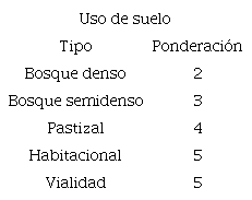 En la segunda fase metodológica para el análisis de desprendimientos se incluyó la posible predisposición que pueda tener la superficie en función de su uso (ST, Ecuación 1). Los usos considerados fueron: bosque denso, bosque semidenso, pastizal, habitacional y vialidades. La digitalización de los polígonos, que representan los diferentes usos y ocupaciones, se obtuvieron directamente mediante la vectorización de las imágenes Google Earth (2018). Posteriormente, la asignación de pesos, en función de su nivel de influencia frente a los desprendimientos, se realizó primeramente considerando algunos trabajos que abordan explícitamente la problemática (Suárez, 1998; Raghuvanshi, Negassa y Kala, 2015), lo que permitió ordenar jerárquicamente los usos del suelo en función de su susceptibilidad a los movimientos de laderas. Como segundo criterio se analizó la frecuencia de los eventos a partir del inventario realizado y se confrontó con los diferentes usos cartografiados (Tabla 4).
