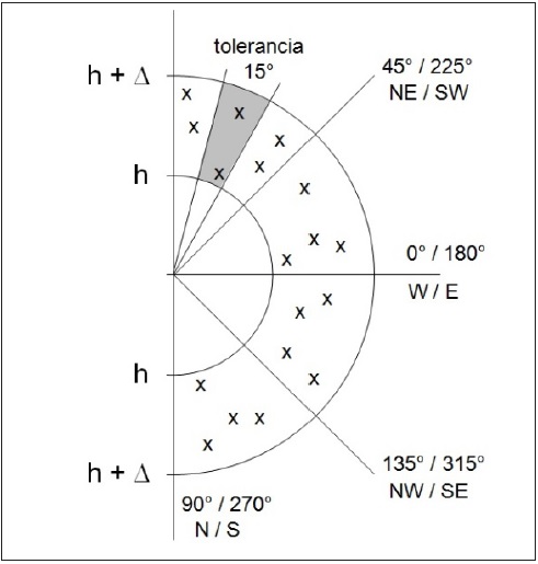 El análisis espacial de variables hidrológicas es, sin duda, uno de los grandes retos de la hidrología moderna. No solo el análisis, sino la representación espacial de variables climáticas, representan un reto y una actividad de gran precisión. A partir de la densidad espacial de los sitios de medición se define una estructura espacial y los patrones de comportamiento dentro de un espacio geográfico (Chou, 2010). Actualmente, se emplean métodos de interpolación espacial para medir y representar cartográficamente casi cualquier medición en campo. Si se trabaja con un espacio bi-dimensional, existirá una relación entre las mediciones efectuadas, producto principalmente de la distancia que los separa, y de la dirección entre dichos puntos de medición. Bajo la hipótesis de que existe una función matemática que representa la variabilidad espacial de la medición efectuada en un entorno o vecindad de un punto, esta medición puede presentar una variación espacial debida a que algunos procesos físicos tienen una cierta orientación predominante. Es decir, se trata de fenómenos con tendencias anisotropícas (Haining, 2003). La Figura 2 muestra un hipotético campo muestral en donde para cada punto de medición existe una distancia (h) y una dirección asociada a su propia medición. Se utilizan líneas radiales para conocer la variabilidad de las mediciones (Hoover y Wolman, 2005). El variograma, también conocido como semivariograma, es una expresión matemática que muestra la variabilidad espacial entre los valores medidos espacialmente; es decir, mide la variabilidad de las mediciones en diferentes direcciones (anisotropía). De esta forma, cualquier modelo de variograma representará correlaciones espaciales entre los sitios de muestreo, lo que constituye el principio básico en el estudio de la variabilidad espacial de variables regionalizadas (Creutin y Obled, 1982). Para realizar un análisis espacial con funciones anisitrópicas se requieren tres etapas: 1) verificar la homogeneidad de los datos medidos; 2) reconocer los patrones de variaciones temporales de los datos (tendencias, componentes cíclicos, etapas estacionales, extremos fuera de rango, etc.) y 3) la simulación o predicción de nuevos valores a partir de las mediciones (Méndez-Venegas, Herrera, Díaz-Viera y Valdés-Manzanilla, 2013).