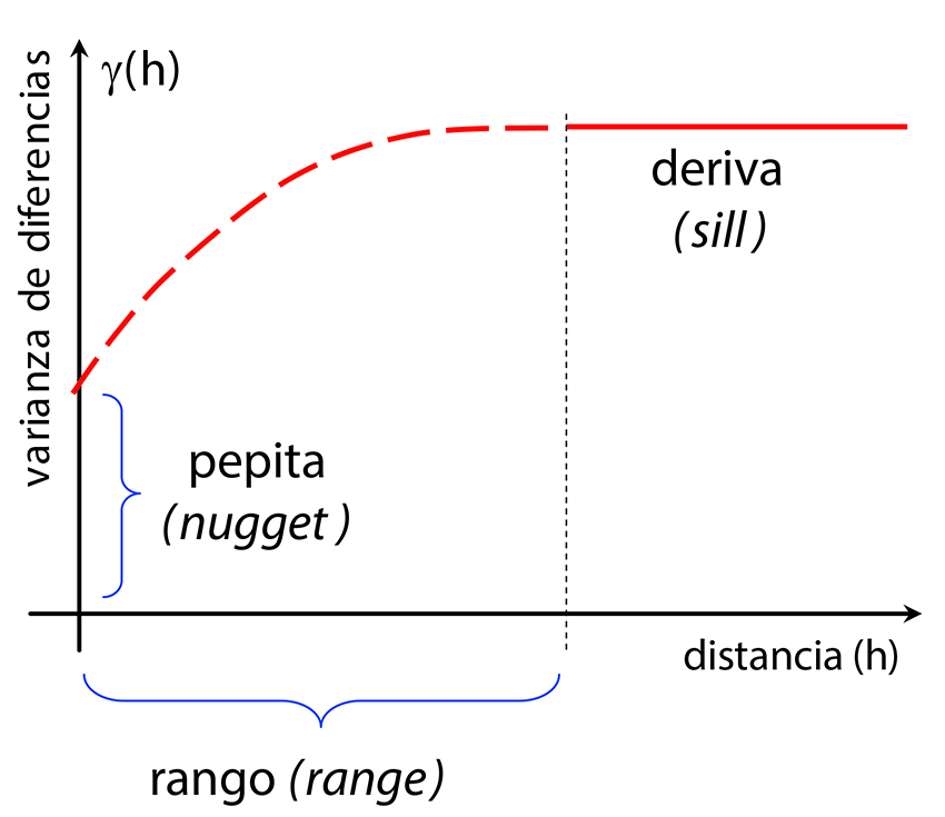 Un ejemplo típico de variograma teórico se observa en la Figura 3, la cual describe que existe una fuerte dependencia espacial entre dos puntos de medición a distancias pequeñas (tramo con pendiente creciente) (Fortanell, Bravo, Alburquerque y Sosa, 2014). Conforme aumenta la distancia (h), la curva se hace horizontal y alcanza un rango de distancia a partir del cual ya no existe dependencia espacial entre un par de mediciones (Asa, Saafi, Membah y Billa, 2012). El procedimiento consiste en tomar las muestras o eventos medidos en campo y ajustar un variograma experimental a través de la ecuación 1 y, posteriormente, ajustar un variograma teórico (esférico, gausiano, exponencial, de potencia, lineal, o logarítmico) para modelar los procesos hidrológicos considerando su variación espacial (Teegavarapu y Chandramouli, 2005). Una excelente recopilación de los diversos tipos de variogramas se muestra en Samper y Carrera (1996).