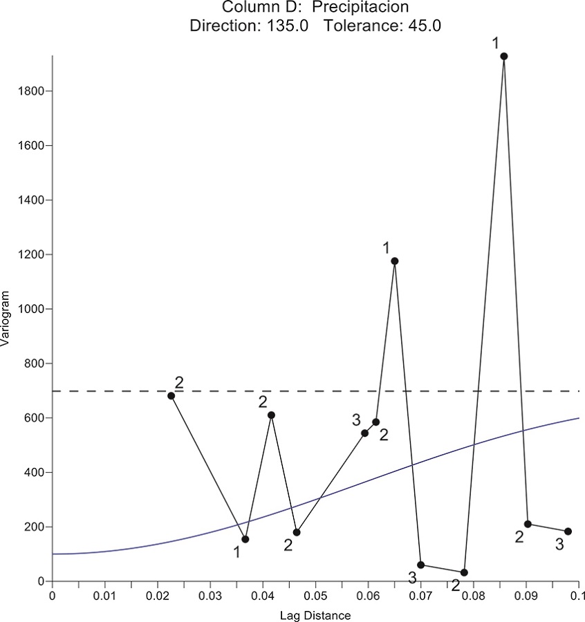 El Kriging en tanto método de interpolación espacial se basa en herramientas matemáticas como el variograma para el análisis de los datos medidos (ecuación 1) (Lin y Chen, 2004). La principal hipótesis en la construcción de un variograma es que, mientras aumenta la distancia, los valores en cada punto dejan de tener correlación (Schlünzen, Hoffmann, Rosenhagen y Riecke, 2009). Sin embargo, en la práctica los valores no se presentan en patrones uniformes, por lo que es necesario emplear esta herramienta geoestadística para cuantificar la correlación espacial entre los valores monitoreados. Actualmente se utilizan una gran variedad de métodos de interpolación espacial. El procedimiento más empleado para el fenómeno de la precipitación es el Kriging ordinario, el cual utiliza un variograma direccional, el Co-Kriging, que utiliza una segunda variable que interviene en la construcción del variograma y el Kriging con deriva que permite introducir un comportamiento inicial en las variables regionales (Adhikary, Muttil y Yilmaz, 2015; Dubois, Malczewski y Cort, 1998; Goovaerts, 2000; Lloyd, 2005). En ese sentido, el variograma resulta ser una herramienta simple y acertada para identificar patrones espaciales en estudios hidrológicos (Hoover y Wolman, 2005; Zhao, Xiao, Zhou, Cheng, Wang, Yin y Ren, 2011).